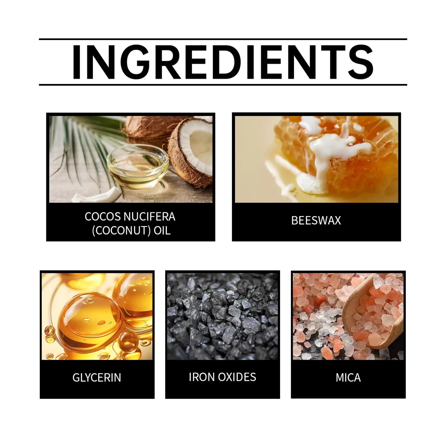 Zutaten: Kokosnussöl, Bienenwachs, Glycerin, Eisenoxid, Mica