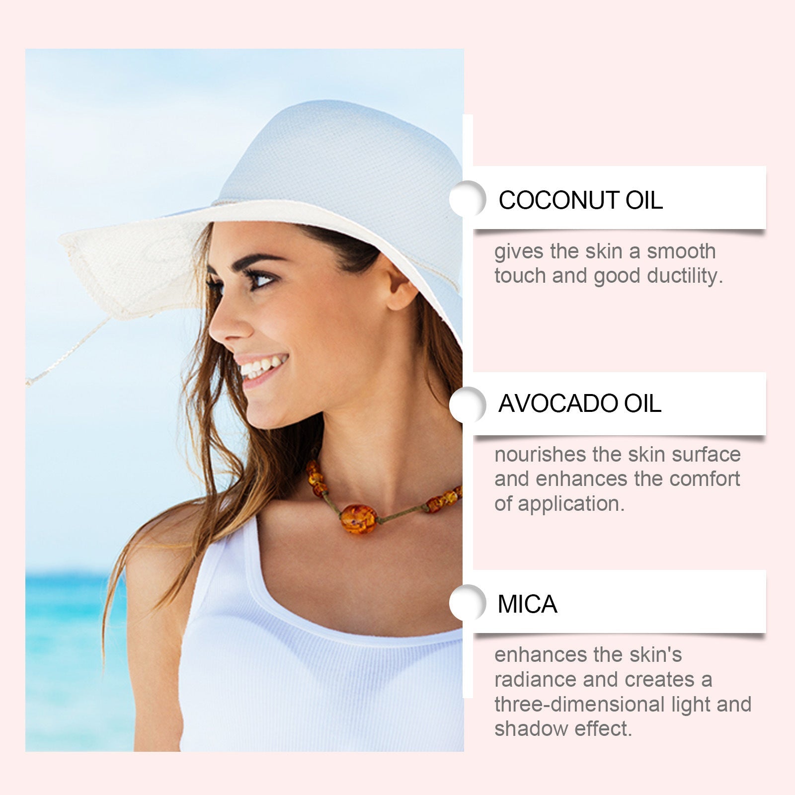 Koostisosad: vedel parafiin, etüülheksüülmetoksütsinmaat, oreliin (looduslik ekstrakt, mis on tuntud selle nahaga toidetavate omaduste poolest), etüülheksüülsalitsülaat (UV-filter), bis-etüülheksüloksüfenooli metoksüfenüül-triasiini (laias spektri päikeseprotektorit), mis aitab Antio-protektorit (ANTO), An Ant Antorecit) (An Ant Antox), An Ant Antoxy. Heksüülglütserool (naha konditsioneeritav aine), kookosõli, avokaadoõli (mõlemad rikkad olulised rasvhapped ja vitamiinid sügava hüdratsiooniks), MICA (looduslik mineraal, mis annab peene läike ja valgustuse).