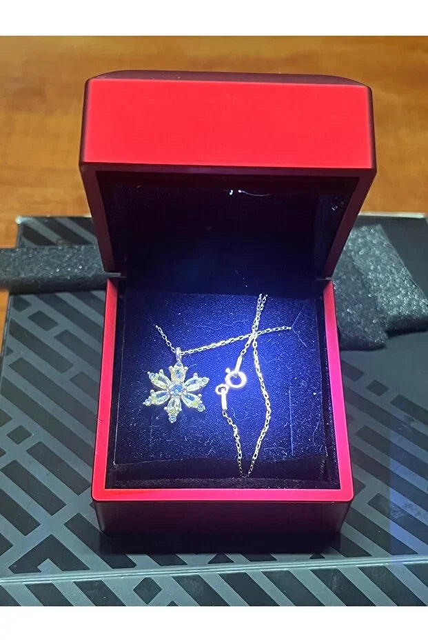 This product features a 925 sterling silver chain with a lotus camellia pendant and an amethyst teardrop stone.