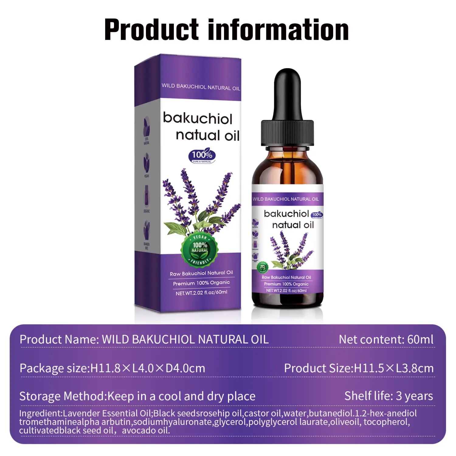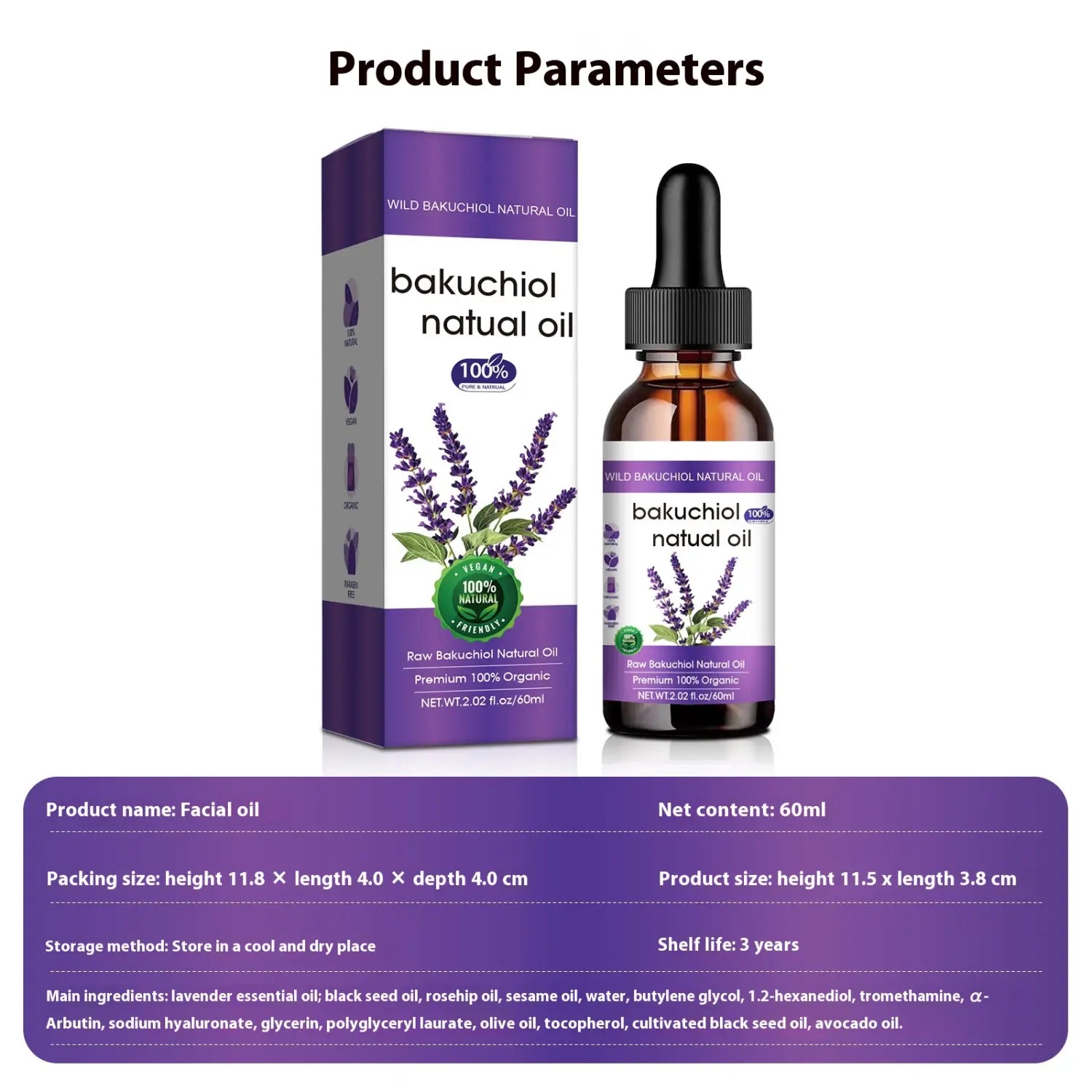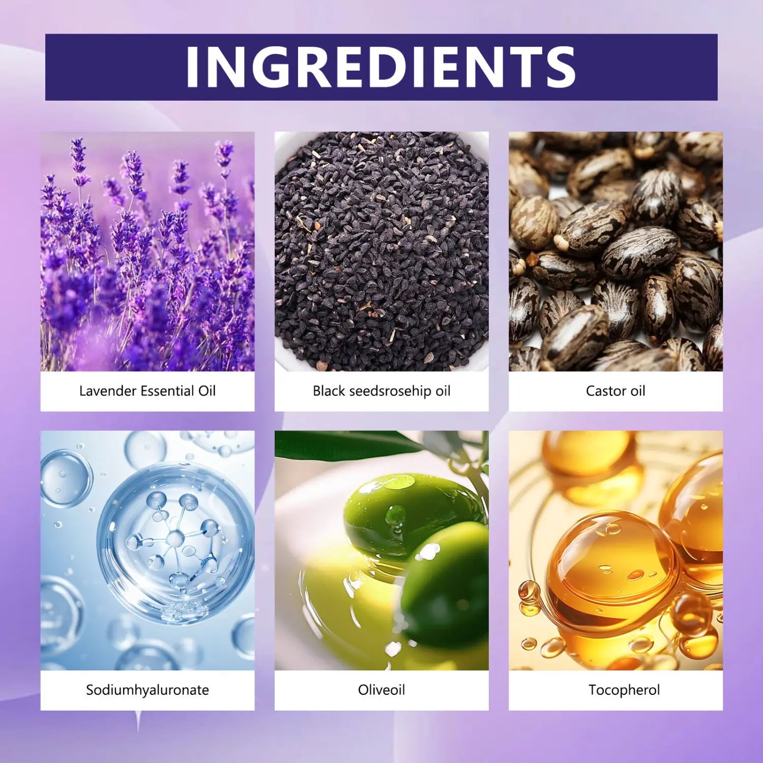Ingredienser: Huvudingredienser: eterisk olja med lavendel; Svart fröolja, rosehipolja, ricinolja, vatten, butylalkohol, 1,2-hexanediol, trometamin, a-arbutin, natriumhyaluronat, glycerol, polyglycerol laurylester, olivolja, tokopherol, odlad svartfrö, avokadoolja
